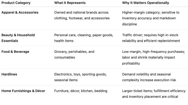The business is organized internally by major merchandise categories for planning and execution