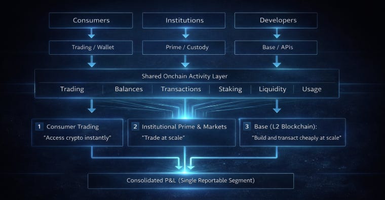 Coinbase reports as a single reportable segment, but economic accountability flows through customer cohorts and the platform surfaces that serve them.