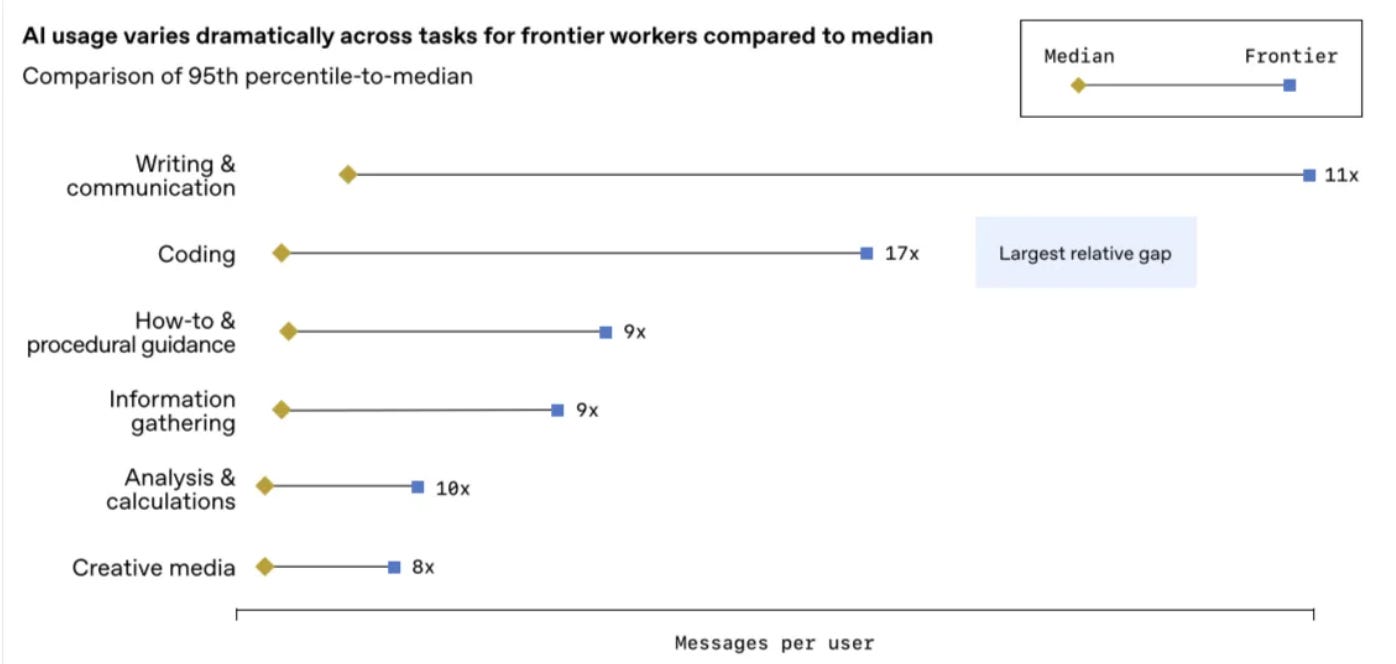Matt Harney at SaaS Letter pointed this out in his State of AI Report. Frontier AI users are overwhelmingly concentrated in writing, communication, and coding.