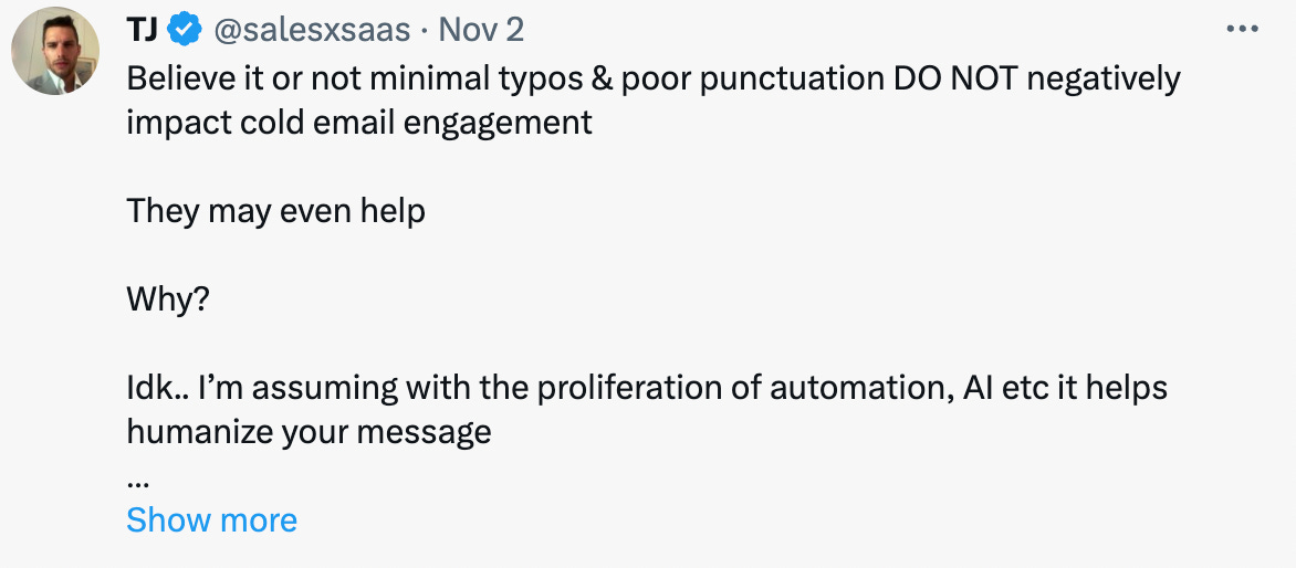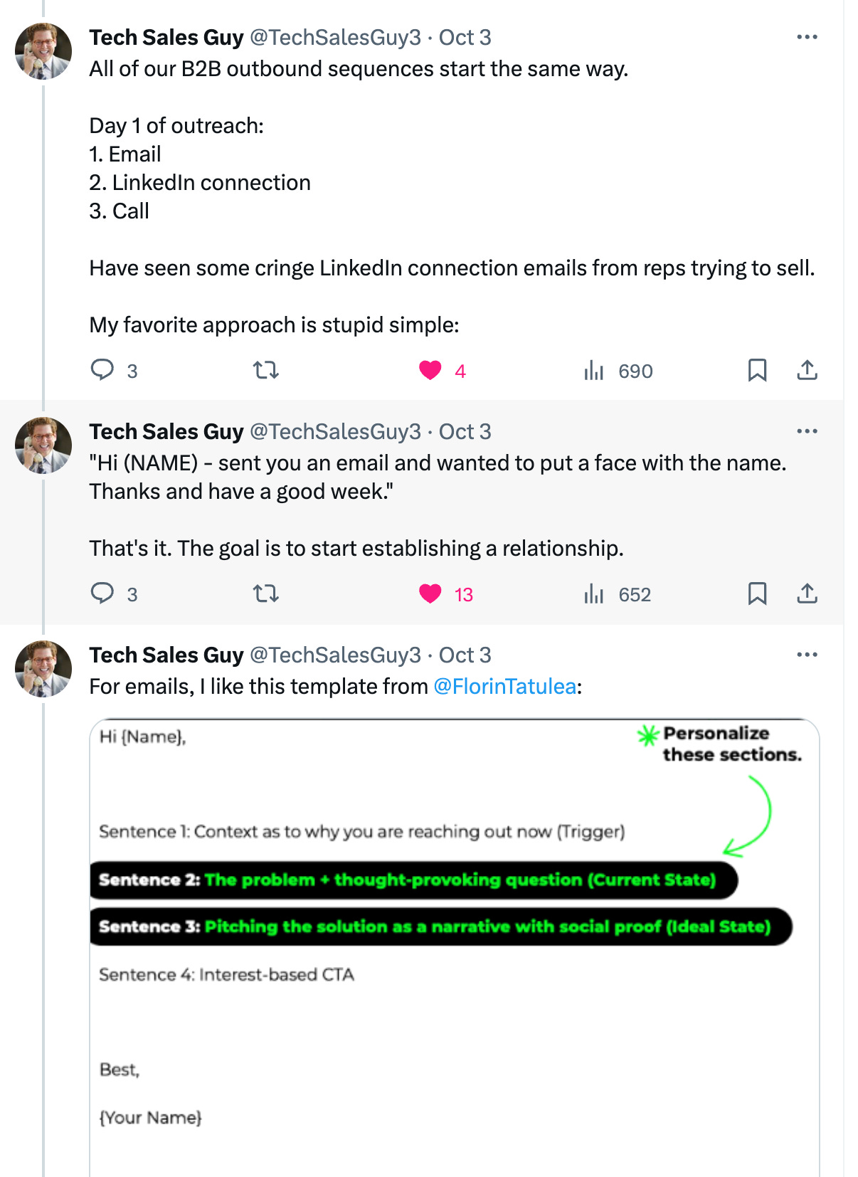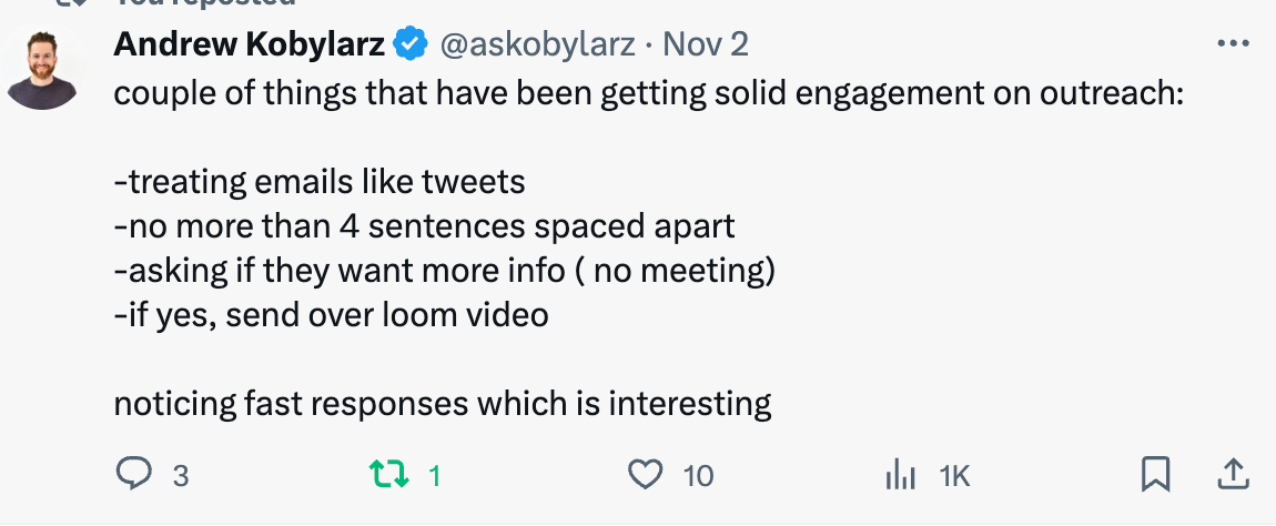 Florin Tatulea uses a 4 sentence framework for his cold outreach. It’s a framework in approaching a way to construct a simple message. You can check out more of his frameworks in his substack here. Candidly, I don’t do this all the time but I’ve found it’s been helpful.
