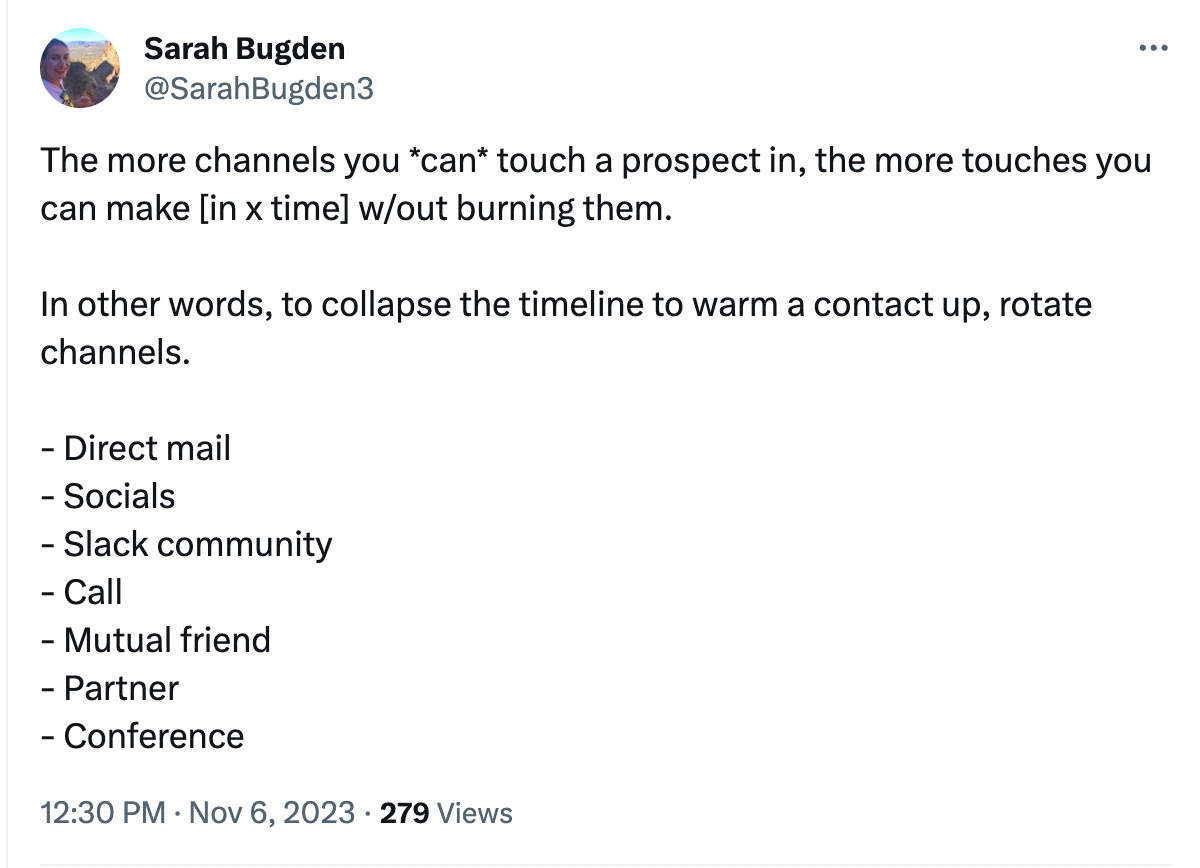 What caught my eye on this post was the framework of condensing “time to meeting”. In other words, increasing the amount of touches across different channels in a given timeframe.