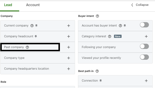 Take it a step further by inputting your customers into the “past companies” field to start filtering for personas, adjacent or target personas, that might have had exposure or familiarity to you product.