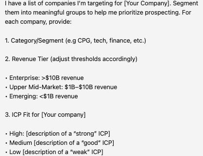 You can take this a step further and even add things like ICP uses cases, upsells, etc. Or even better - upload the finalized CSV into a GPT project folder and reference for future ways to cross reference your accounts.
