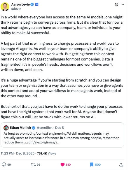 As AI models and tools have become widely accessible, returns don’t converge - they diverge. The advantage shifts to those who know how to make AI effective: by giving it context, shaping workflows, and applying judgement.